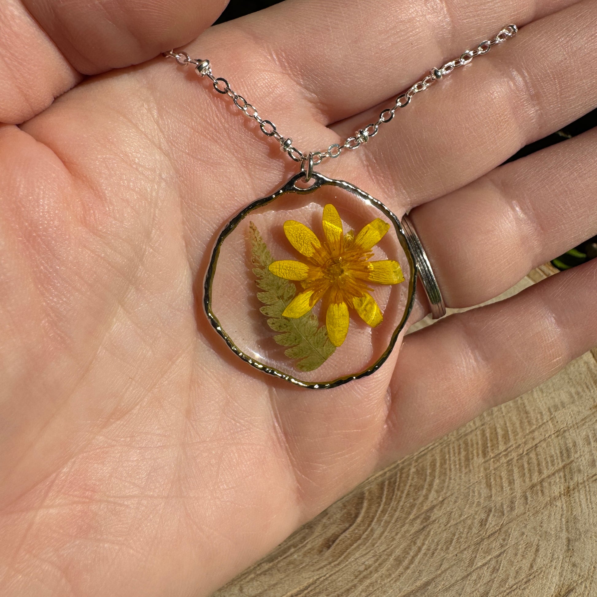 This necklace captures the gentle beauty of spring woodlands — where golden celandine blooms peek through fern-covered forest floors. Each real flower and fern is hand-pressed, carefully arranged, and preserved in jewelry-grade resin to create a timeless keepsake from nature.